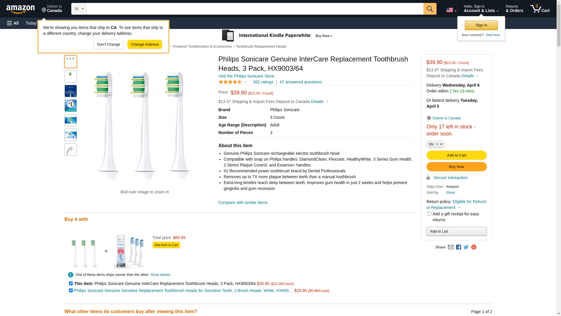 Philips Sonicare Genuine InterCare Replacement Toothbrush Heads, 3 Pack, HX9003/64