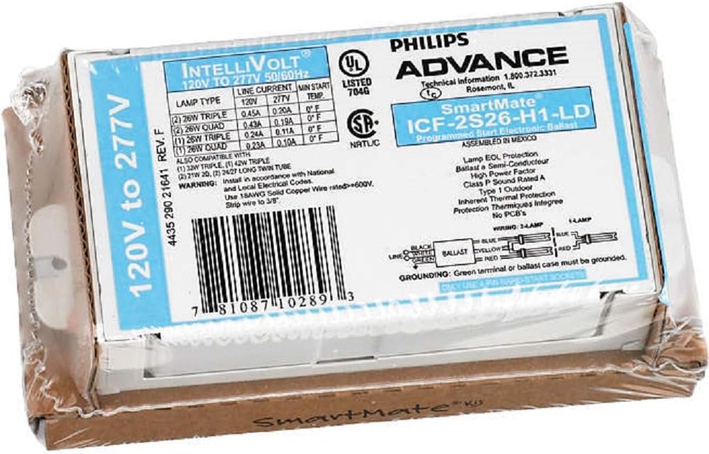 Offering maximum versatility, the Philips Advance family of SmartMate ballasts for 4-pin compact fluorescent lamps drive a broad range of fluorescent lamps. The Advance ICF-2S42-M2-LD-K electronic fluorescent ballast operates (2) 42 Watt CFL lamps at 120/277 input volts. Ideal for use in normal light areas, this programmed start ballast is typically used in offices, board rooms, and retail. Also operates FC9T5, FC12T5, CFM26W/GX24Q, CFM32W/GX24q, CFM42W/GX24q, CFM57W/GX24Q, CFM70W/GX24Q, CFQ26W/G24q, CFS28W/GR10q, CFS38W/GR10q, CFTR57W/GX24Q, FT24W/2G11 and FT40W/2G11.