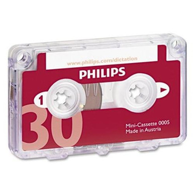 Philips 0005 Executive 30 Minute Mini-Cassette Tape - 5 pack Leaderless Audio Mini Cassette Tape. 15 Minutes Per Side for a Total of 30 Minutes Per Cassette. Tape Size: 2 ¼ inches wide x 1 ½ inches tall. Pack of 5 Mini Cassette Tapes. Tape comes with clip holder which attaches mini cassette to file folder.