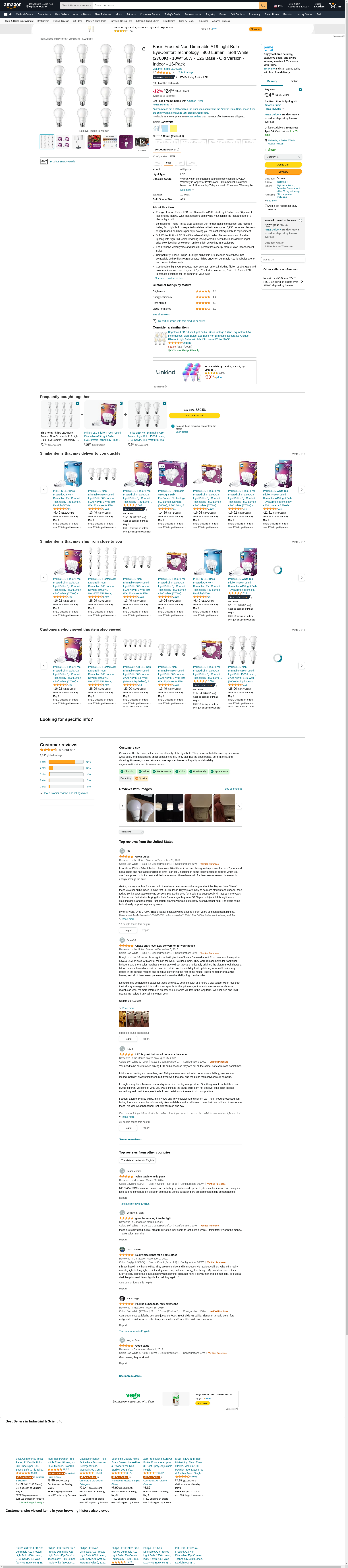 Philips LED Basic Frosted Non-Dimmable A19 Light Bulb - EyeComfort Technology - 800 Lumen - Soft White (2700K) - 10W=60W - E26 Base - Old Version - Indoor - 16-Pack