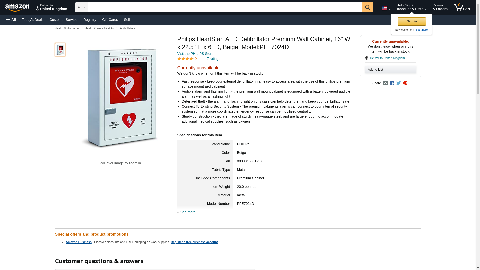 Philips HeartStart AED Defibrillator Premium Wall Cabinet, 16" W x 22.5" H x 6" D, Beige, Model:PFE7024D