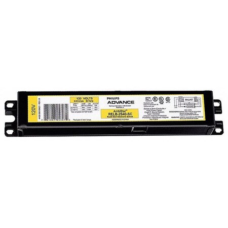 As an Amazon Associate, we earn from qualifying purchases. Electronic Ballast, T12 Lamps, 120V Philips Advance . RELB2S40SC Gallery Attributes Brand name, Manufacturer name, ManufacturerPhilips Advance Attribute00Electronic Ballast Attribute0173 Attribute02AmbiStar(TM) Attribute03Normal Attribute0450 Degrees F Attribute05Greater than 0.98 Attribute06, Attribute07, Attribute152 Attribute08Less Than 20% Attribute090.62 Attribute101-3/16" Attribute11Series Attribute120.85 Attribute139-1/2" Attribute141-11/16" Attribute16, countryOfOriginMexico AttributeKey00Item AttributeKey01Input Watts AttributeKey02Ballast Family AttributeKey03Light Output AttributeKey04Min. Starting Temp. AttributeKey05Power Factor AttributeKey06Number of F40T12 Lamps AttributeKey07Number of F34T12 Lamps AttributeKey08Total Harmonic Distortion AttributeKey09Amps AC AttributeKey10, height_AttribHeight AttributeKey11Wiring Type AttributeKey12Ballast Factor AttributeKey13, length_AttribLength AttributeKey14, width_AttribWidth AttributeKey15Number of F30T12 Lamps AttributeKey16Country of Origin (subject to change) DimensionUnitinch Extra Product NameElectronic Ballast, T12 Lamps, 120V WeightUnitlbs extendedLead, moq, multiple, tierMinQty11 height1.1875 length9.5 MPNRELB2S40SC qtyInStock-1 SKUG2580234 tierPrice118.26 urlhttps://www.zoro.com/i/G2580234 width1.6875 Distributor offers SellerSKUMOQIn stockMultiplePrices ZoroG25802341In Stock11 @ $18.26