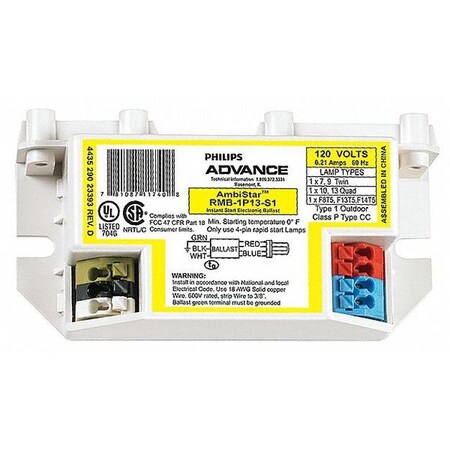 As an Amazon Associate, we earn from qualifying purchases. CFL Ballast, Electronic, 14W, 120V Philips Advance . RMB1P13S1 Gallery Attributes Brand name, Manufacturer name, ManufacturerPhilips Advance Attribute00, Attribute16Electronic Attribute0114 Attribute02, Attribute04, Attribute07, Attribute08, Attribute10, moq, multiple, tierMinQty11 Attribute03Parallel Attribute0532 Degrees F Attribute061" Attribute09Normal Attribute114 Pin Attribute12CFL Ballast Attribute133-1/2" Attribute141-1/2" Attribute15A38 Attribute17, countryOfOriginMexico AttributeKey00Ballast Type AttributeKey01Input Watts AttributeKey02Number of F13DBX Lamps AttributeKey03Wiring Type AttributeKey04Number of F7BX Lamps AttributeKey05Min. Starting Temp. AttributeKey06, height_AttribHeight AttributeKey07Number of F9BX Lamps AttributeKey08Number of F13BX Lamps AttributeKey09Light Output AttributeKey10Ballast Factor AttributeKey11Base Type AttributeKey12Item AttributeKey13, length_AttribLength AttributeKey14, width_AttribWidth AttributeKey15Dimension Reference AttributeKey16Fixture Ballast Type AttributeKey17Country of Origin (subject to change) DimensionUnitinch Extra Product NameCFL Ballast, Electronic, 14W, 120V WeightUnitlbs extendedLead11 height1.0 length3.5 MPNRMB1P13S1 qtyInStock-1 SKUG1968522 tierPrice118.23 urlhttps://www.zoro.com/i/G1968522 width1.5 Distributor offers SellerSKUMOQIn stockMultiplePrices ZoroG19685221In Stock11 @ $18.23
