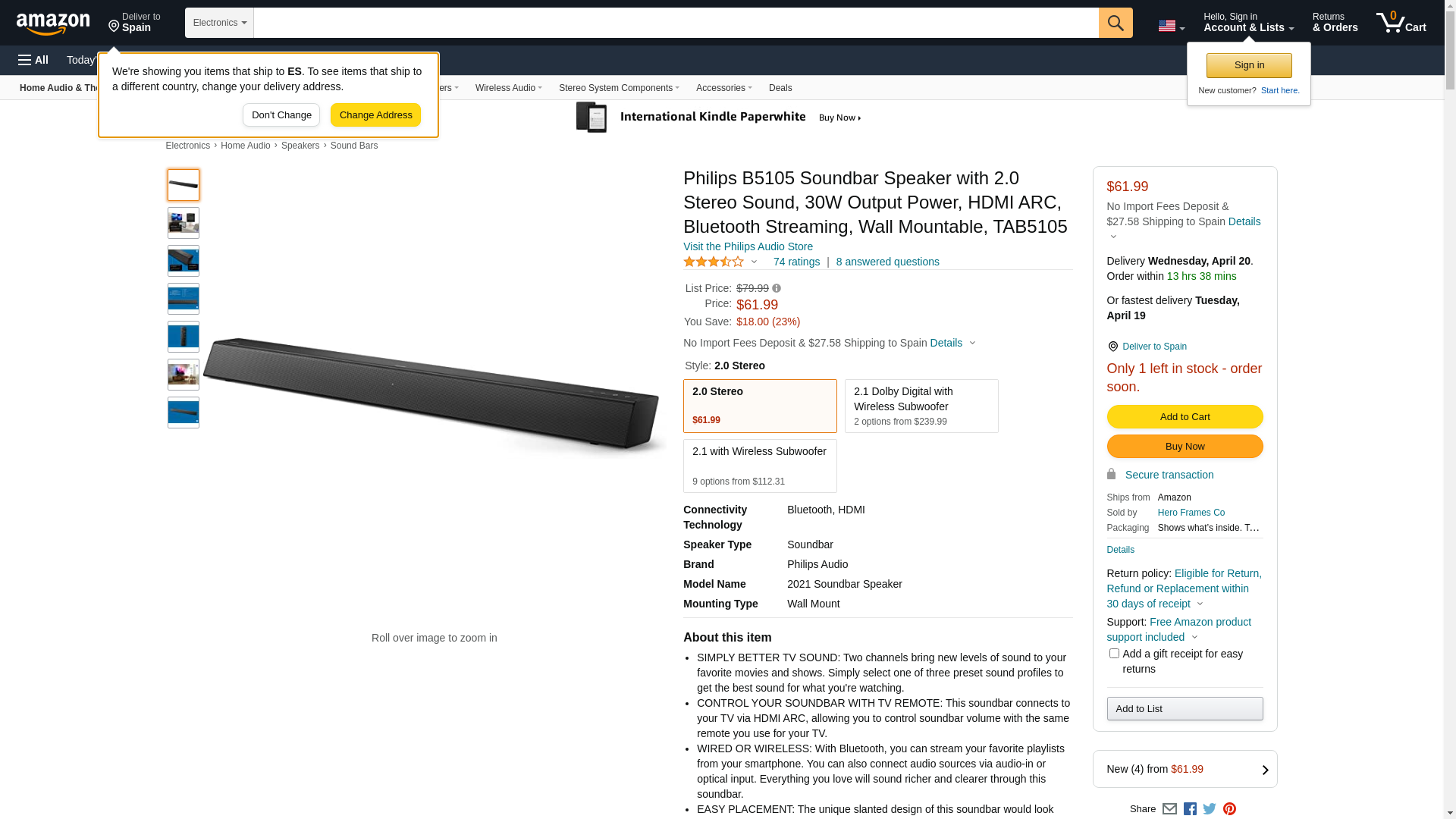 Philips Audio 2.0 Soundbar Speaker with HDMI Input (ARC) Remote Control with Bluetooth Streaming (TAB5105) (TAB5105/37)