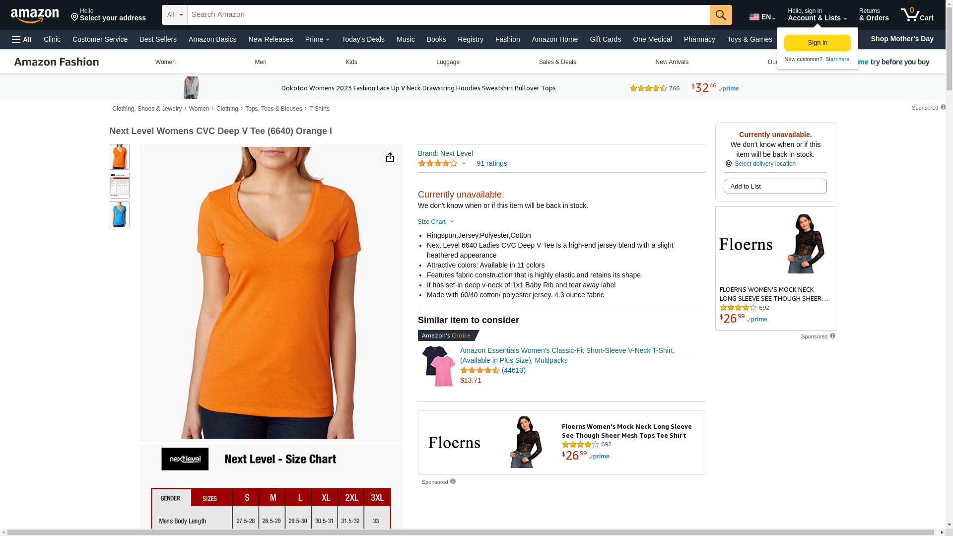 Next Level 6640 CVC Deep V Tee Orange Small