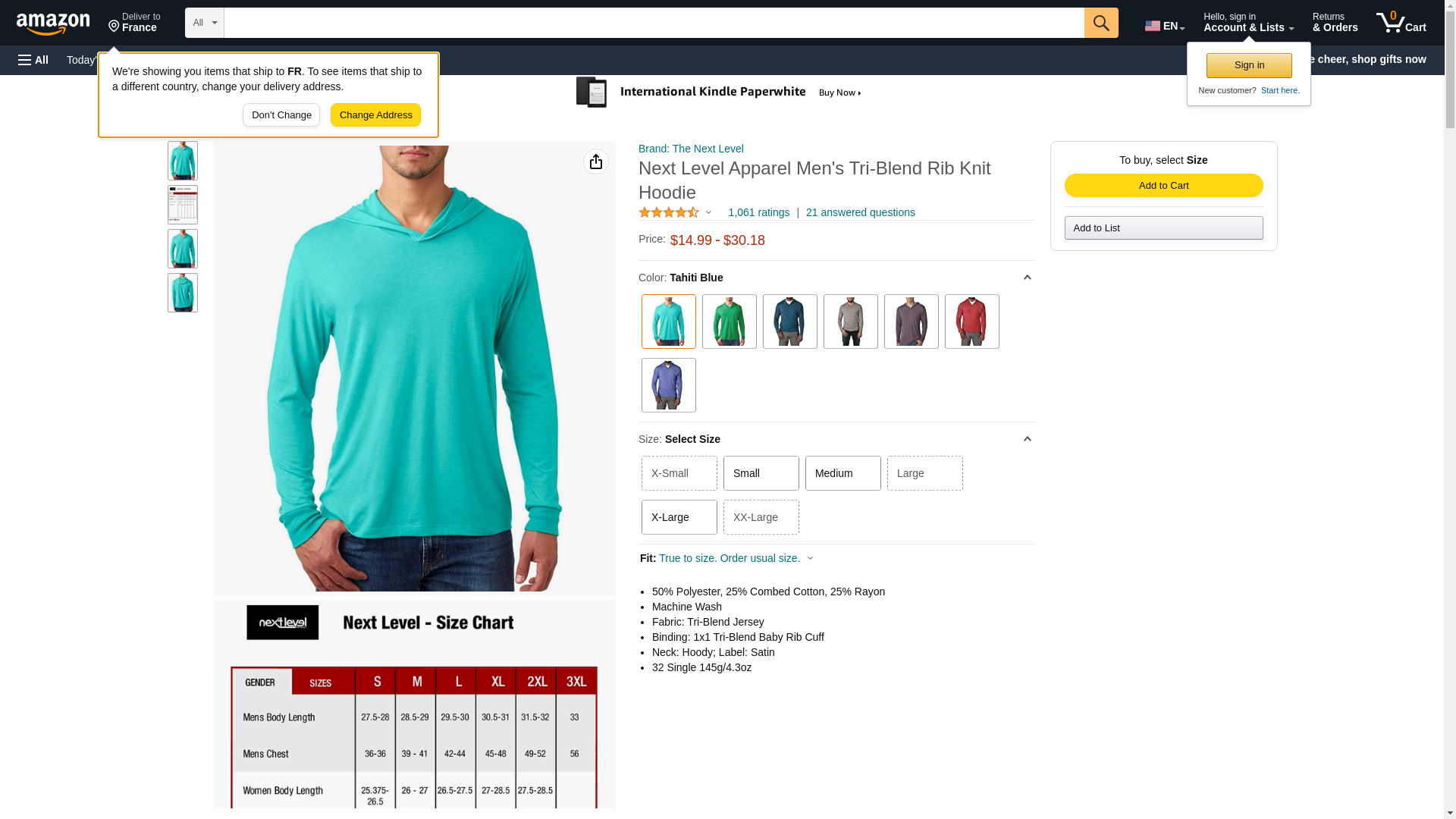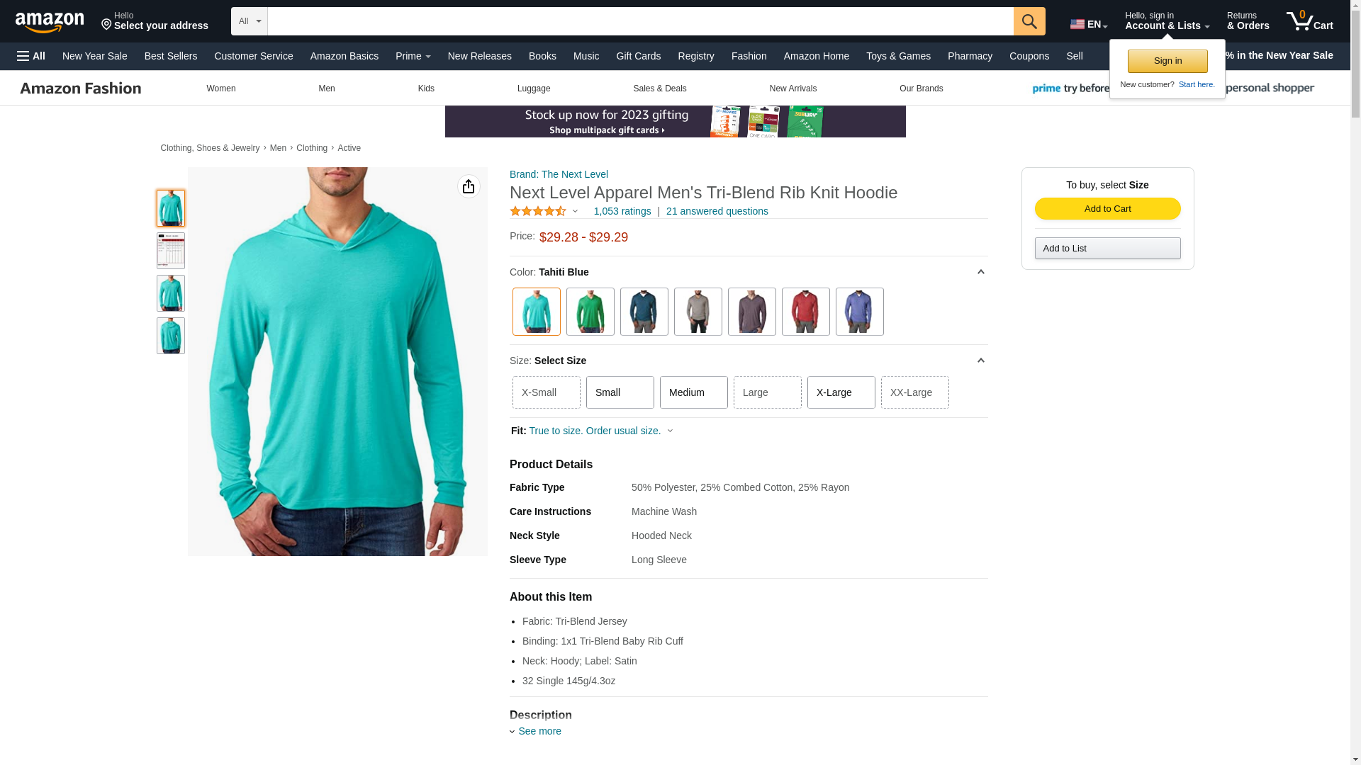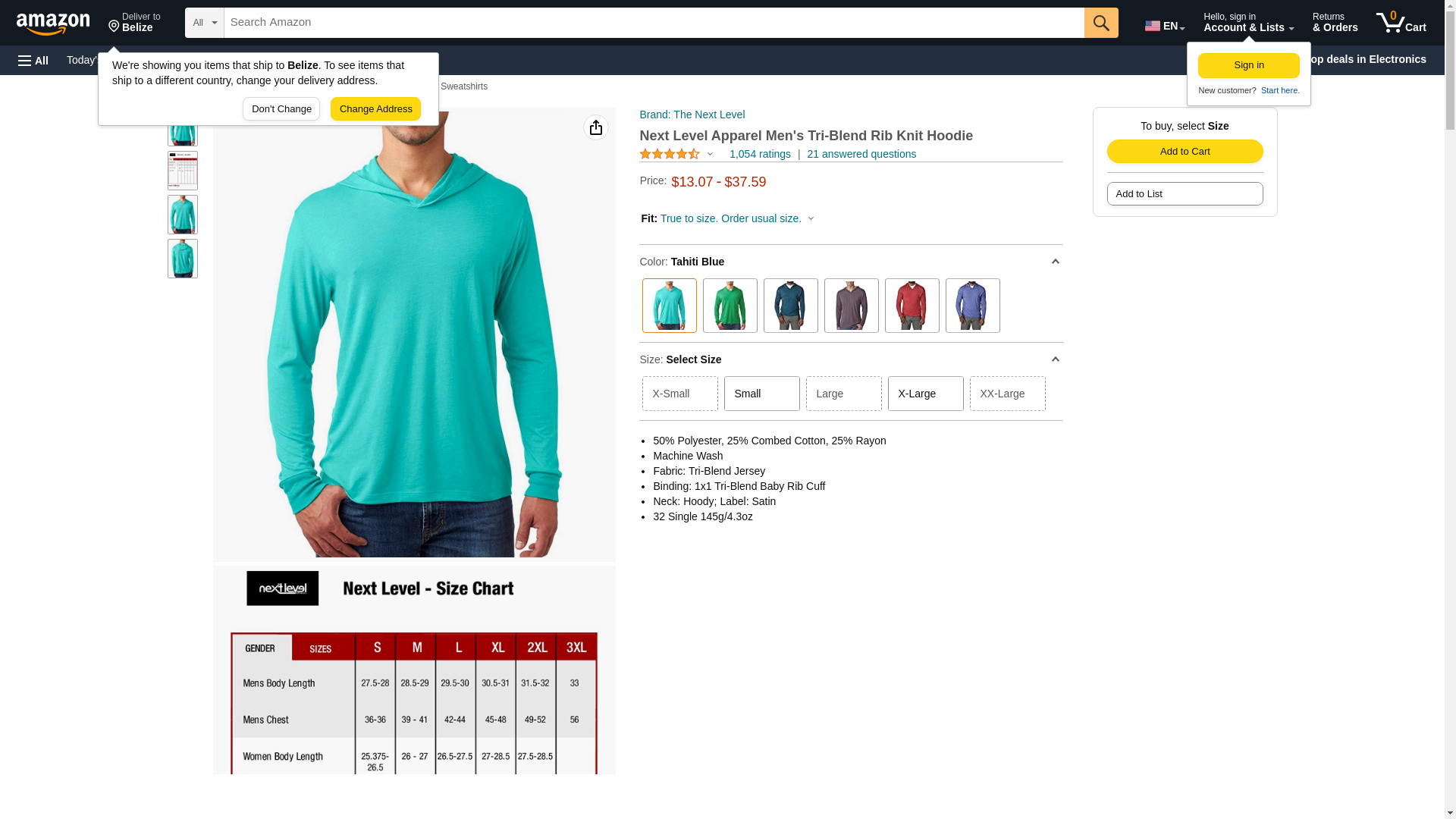 Next Level Men's Tri-Blend Rib Knit Hooded Sweatshirt, X-Large, Tahiti Blue