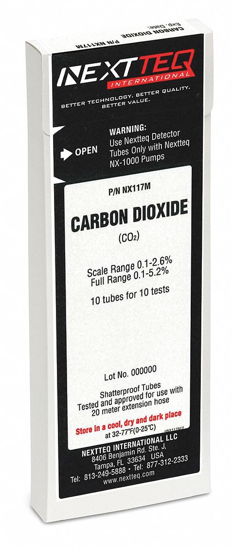 Detector Tube, Carbon Dioxide, Detector Tube Application Air Contamination Test In Buildings, Closed Vessels, Tunnels, Other Confined Spaces, CO2 Concentration Control In Green Houses, Poultry Farm, Fruit Storage, Measuring Range 0.2 to 5.2 Percent, 0.1 to 2.6 Percent vol, For Use With Mfr. No. NX-1000, 20-Meter Extension Hose, Material Glass, Tip Break Off, Package Quantity 10