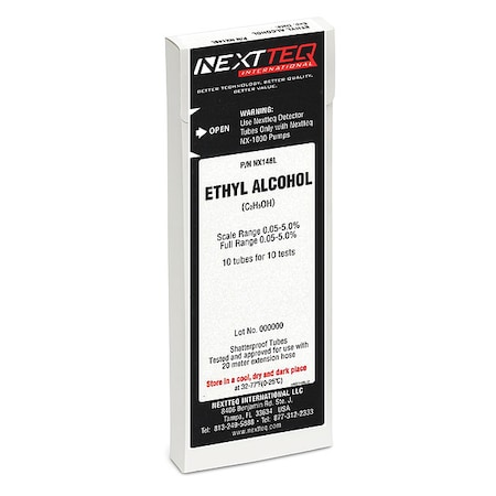 Detector Tube, Ethyl Alcohol, Detector Tube Application Fire Hazard Detection In Hospital, Laboratory, Pharmaceutical Industry, Manufacturing Perfumes and Cosmetics, Measuring Range 0.05 to 5.0 Percent vol, For Use With Mfr. No. NX-1000-100, NX-1000-130, NX-1000-150, NX-1000-200, NX-1000-230, NX-1000-250, Material Glass, Tip Break Off, Package Quantity 10