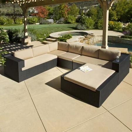 <li>Includes: left sofa, right sofa, table, corner chair, armless chair</li> <li>Material: Black PE Wicker and Sunbrella? Fabric cushions</li> <li>Finish: Light beige cushions and black wicker</li> <li>Reconfigure into any arrangement</li> <li>No assembly required</li>