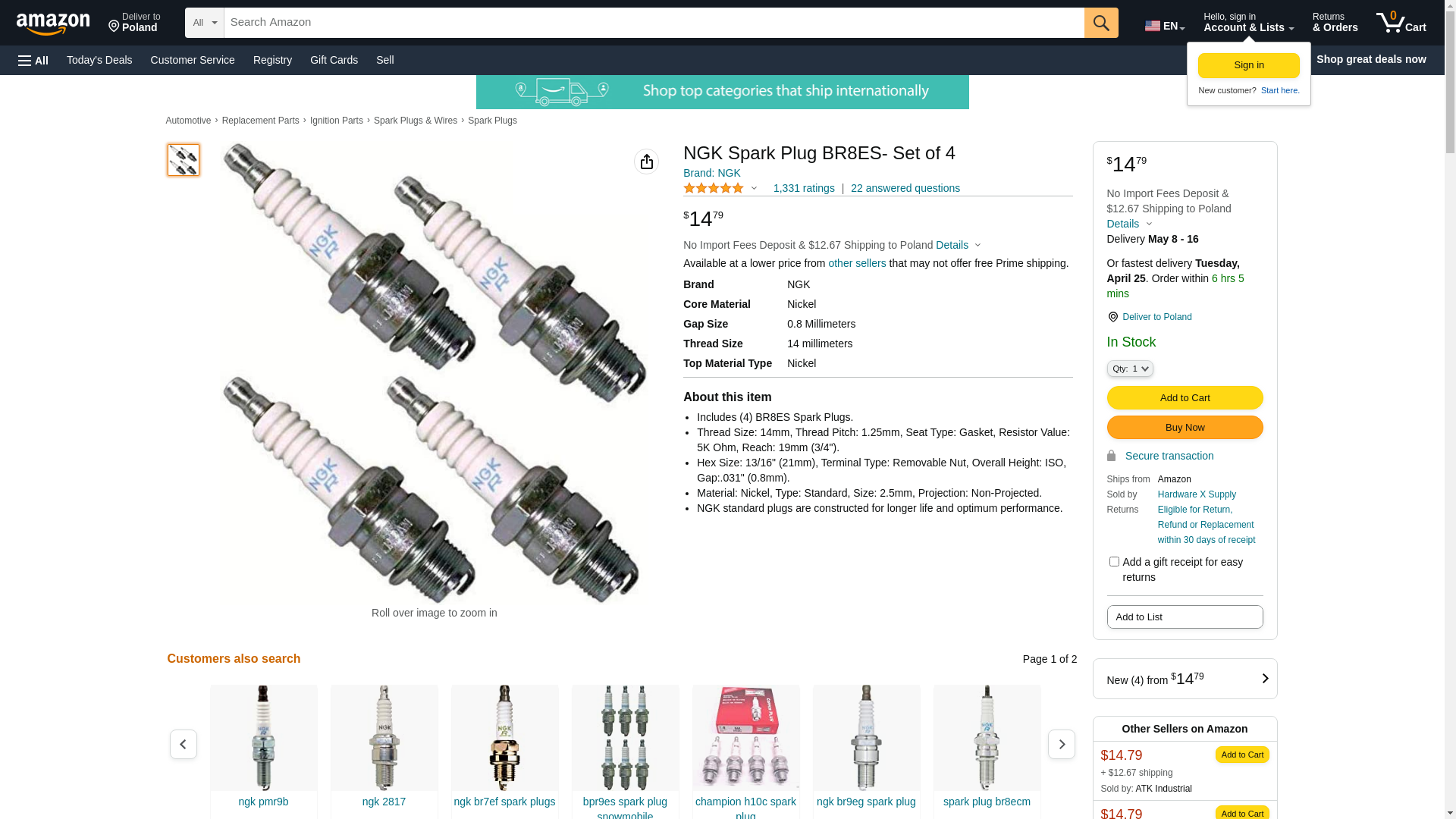 Includes (4) BR8ES Spark PlugsThread Size: 14mm, Thread Pitch: 1.25mm, Seat Type: Gasket, Resistor Value: 5K Ohm, Reach: 19mm (3/4").Hex Size: 13/16" (21mm), Terminal Type: Removable Nut, Overall Height: ISO, Gap:.031" (0.8mm)Material: Nickel, Type: Standard, Size: 2.5mm, Projection: Non-ProjectedNGK standard plugs are constructed for longer life and optimum performance.Compatible with the Following:Autolite: 3704, 402, 4063, XS4063, Bosch: W4CC, WR4CC, WR4CP, WR5CC, Champion: 818, 8902, OE108, T10, ON3, QN3, QN3C, RN2C, RN3, RN3C, Torch: F8RC