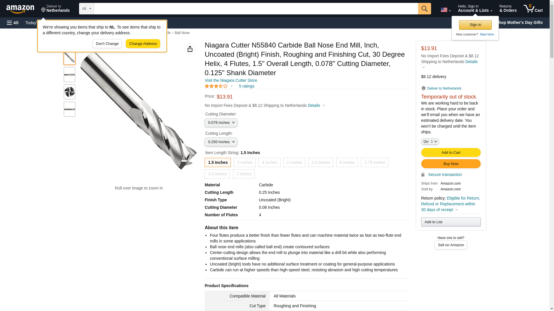 Niagara Cutter N55840 Carbide Ball Nose End Mill, Inch, Uncoated (Bright) Finish, Roughing and Finishing Cut, 30 Degr...