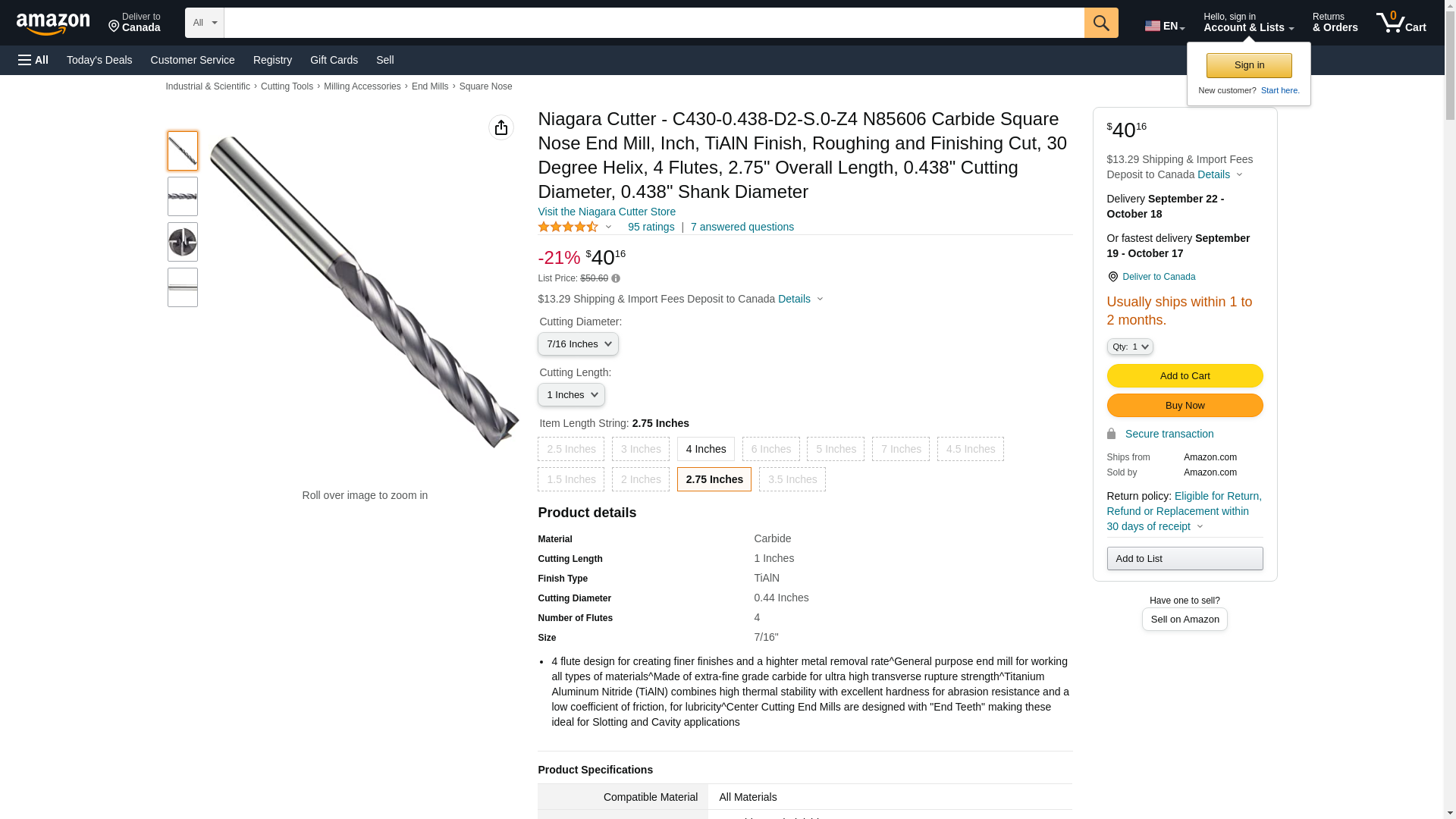 Niagara Cutter N85606 Carbide Square Nose End Mill, Inch, TiAlN Finish, Roughing and Finishing Cut, 30 Degree Helix, 4 Flutes, 2.75" Overall Length, 0.438" Cutting Diameter, 0.438" Shank Diameter
