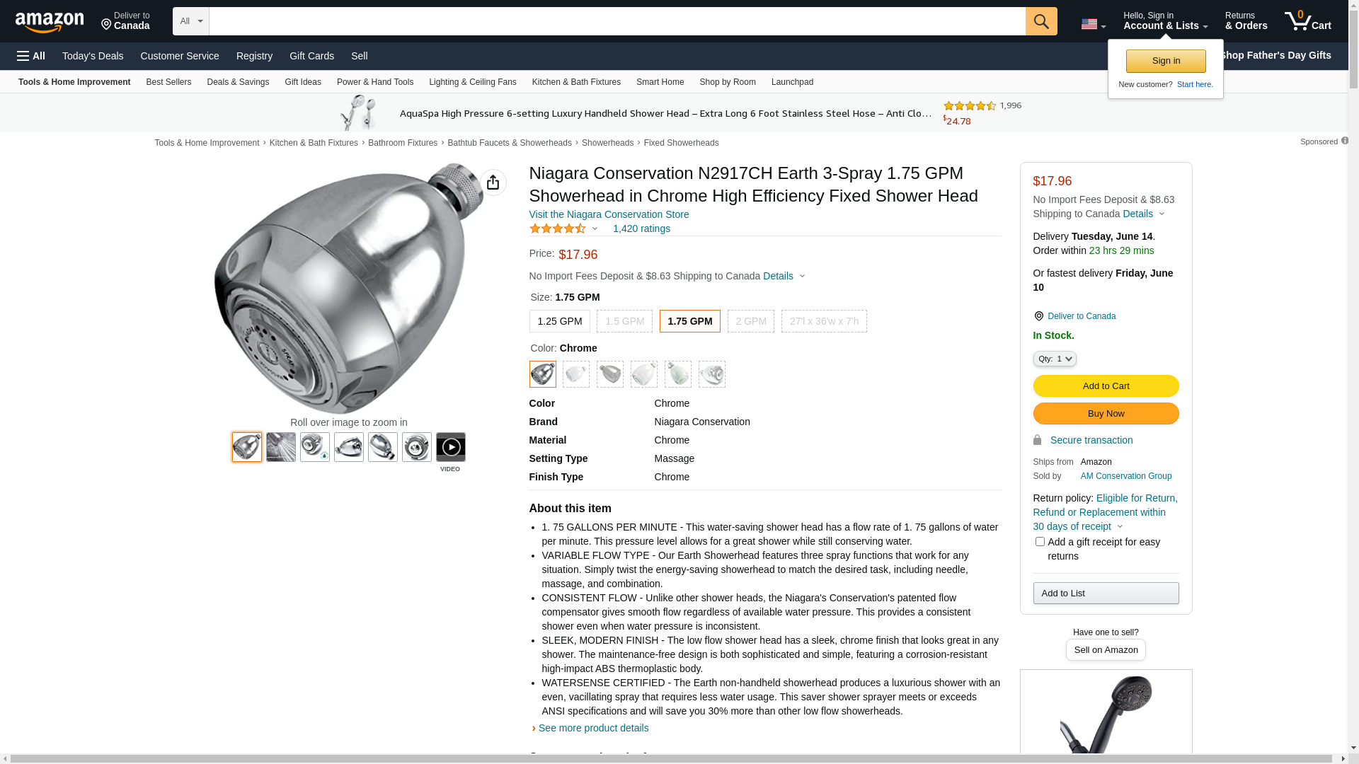 The 1.75 gpm adjustable spray of this showerhead delivers a broad, rain-like spray or a focused, pulsating massaging spray. It is self-cleaning, and the non-aerated spray mean less temperature loss between the showerhead and you. This showerhead has a plastic showerhead with a chrome finish and a chrome plated brass collar. Standard 1/2" inside threads. Standards and Certifications: CSA, California Energy Commission, ANSI Manufacturer Warranty: 10 years