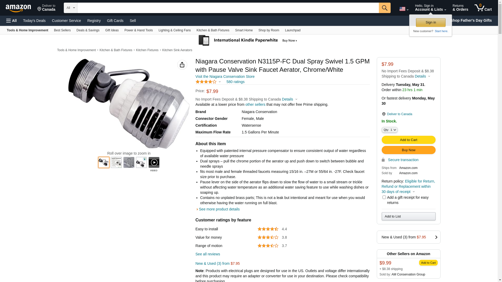 Niagara Conservation - N3115P-FC 1.5 GPM Kitchen Dual Spray Swivel with Pause Valve California Compliant Sink Faucet Aerator - Standard Chrome and White Sink Aerator with Low Flow Rate