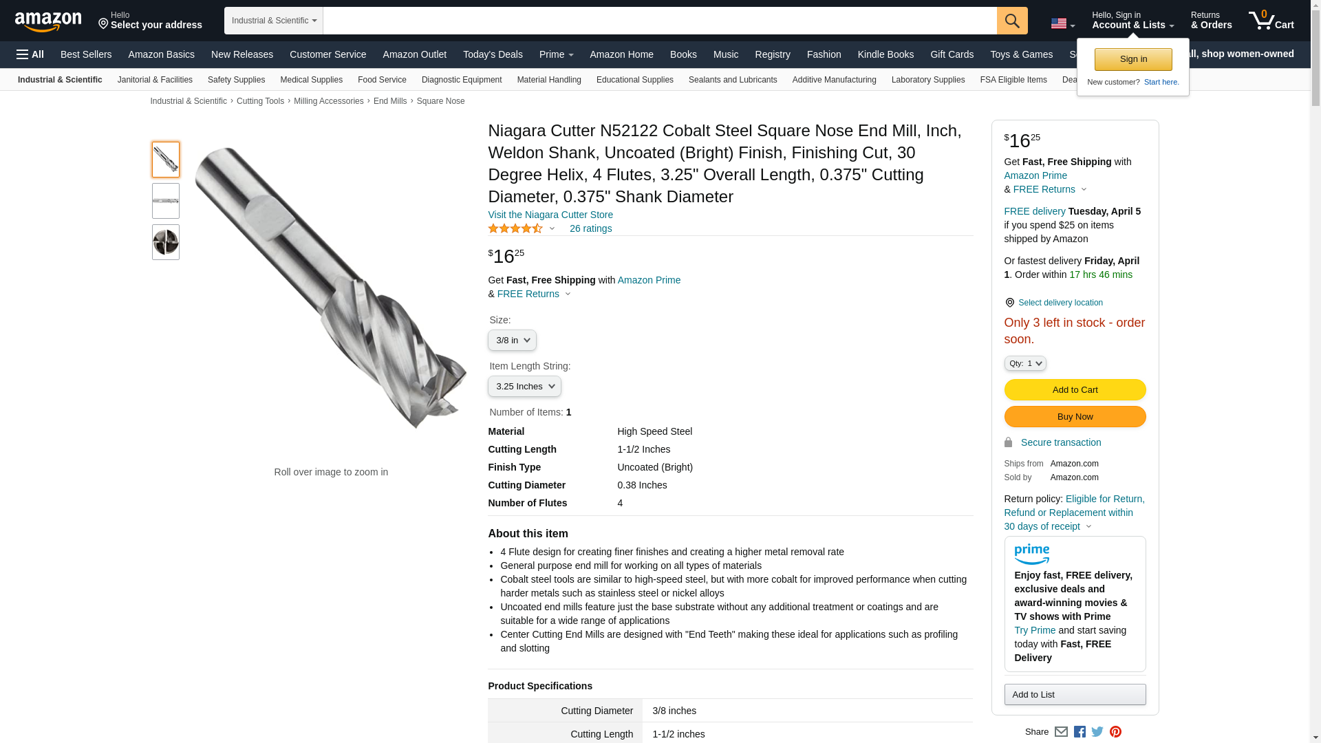 Niagara Cutter N52122 Cobalt Steel Square Nose End Mill, Inch, Weldon Shank, Uncoated (Bright) Finish, Finishing Cut, 30 Degree Helix, 4 Flutes, 0.375" Cutting Diameter, 0.375" Shank Diameter