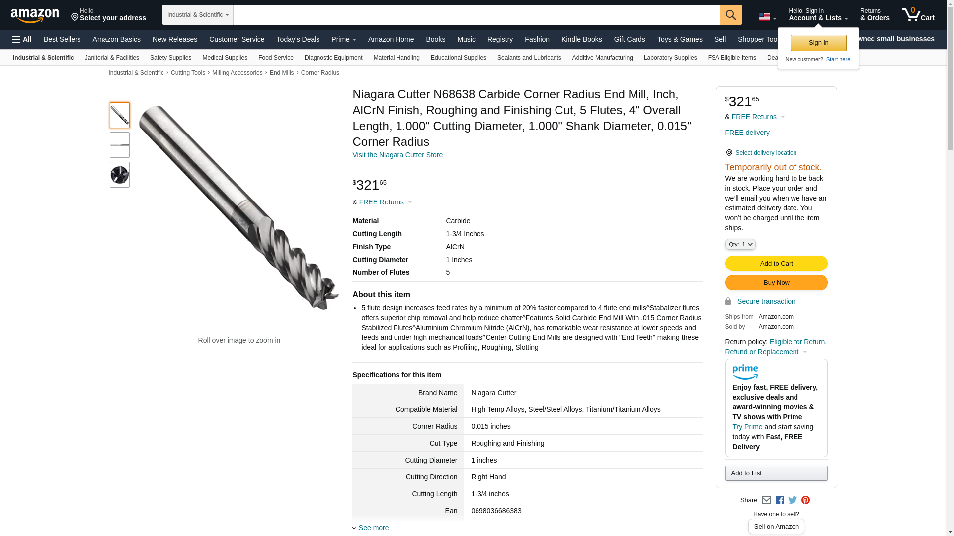 Niagara Cutter N68638 Carbide Corner Radius End Mill, Inch, AlCrN Finish, Roughing and Finishing Cut, 5 Flutes, 4" Ov...