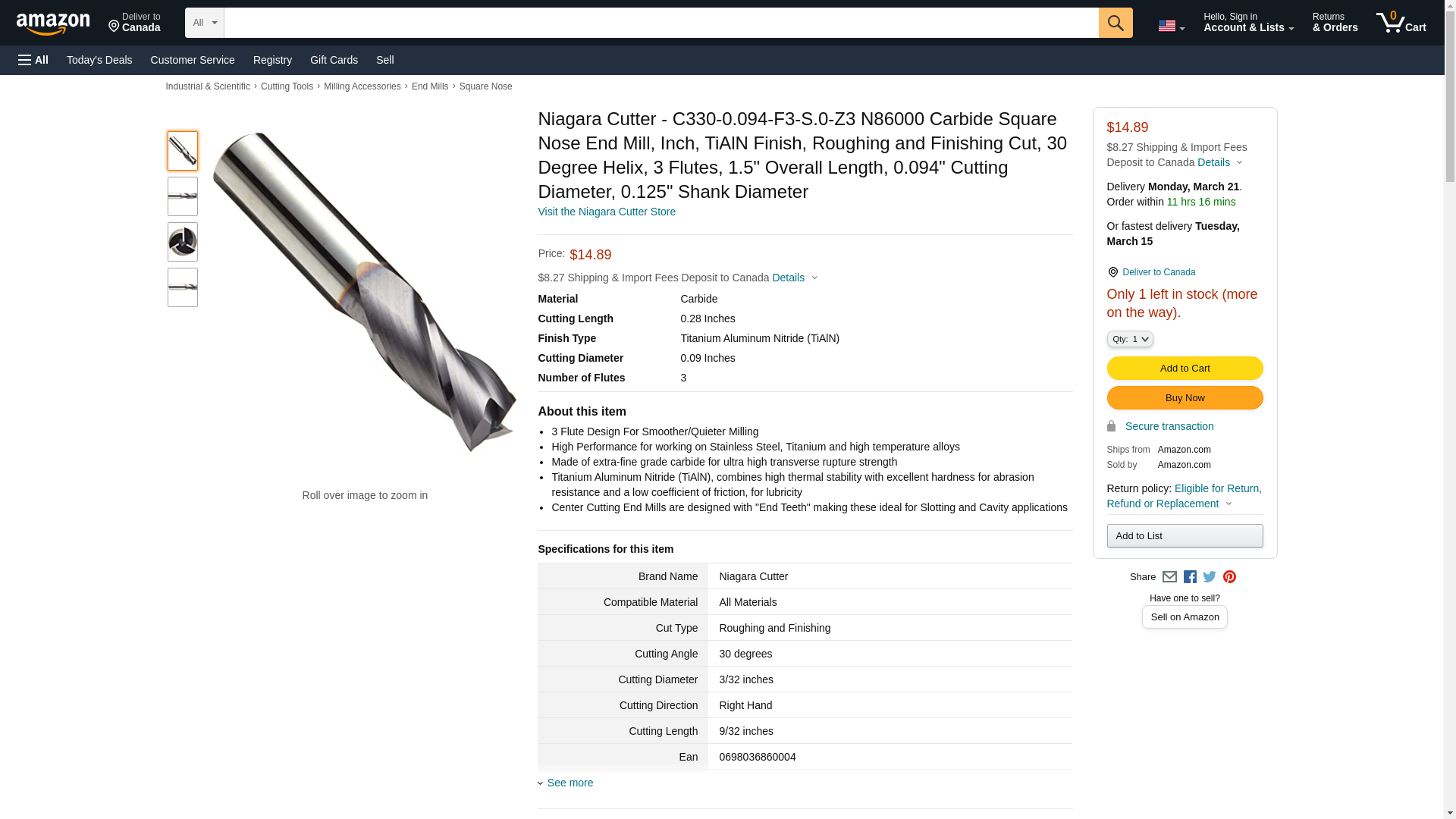 Niagara Cutter N86000 Carbide Square Nose End Mill, Inch, TiAlN Finish, Roughing and Finishing Cut, 30 Degree Helix, 3 Flutes, 1.5" Overall Length, 0.094" Cutting Diameter, 0.125" Shank Diameter