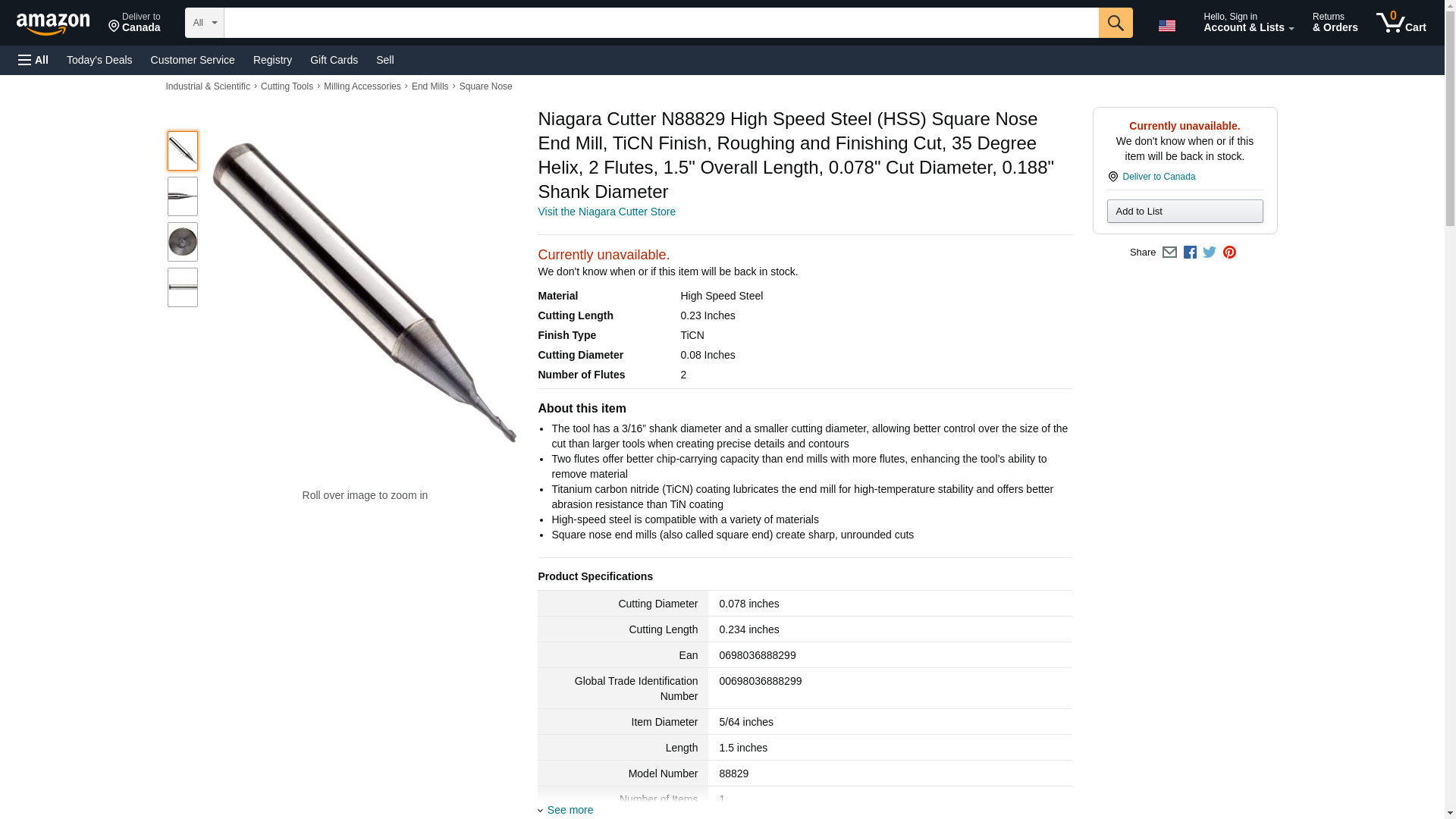 Niagara Cutter N88829 High Speed Steel (HSS) Square Nose End Mill, TiCN Finish, Roughing and Finishing Cut, 35 Degree Helix, 2 Flutes, 1.5" Overall Length, 0.078" Cut Diameter, 0.188" Shank Diameter