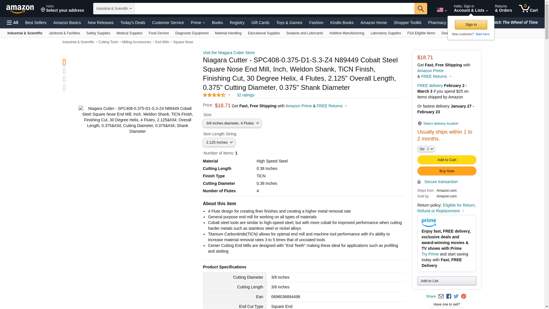 Niagara Cutter N89449 Cobalt Steel Square Nose End Mill, Inch, Weldon Shank, TiCN Finish, Finishing Cut, 30 Degree Helix, 4 Flutes, 0.375" Cutting Diameter, 0.375" Shank Diameter