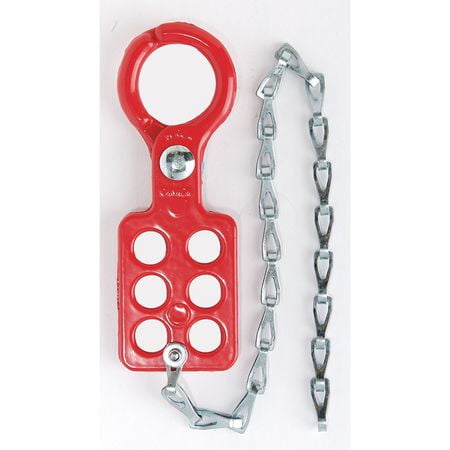 <p>Protect your items with this lockout hasp from Niagara. It accommodates a maximum of 6 padlocks with 3/8" padlock shackle maximum diameter. It is made of aluminum and comes in red. The dimensions are 1-1/2" wide by 4-3/8" long.</p> <p><br /><b>Features</b></p> <ul> <li>Color: Red</li> <li>Includes: 1 ft. Chain</li> <li>Item: Lockout Hasp</li> <li>Length: 4-3/8"</li> <li>Material: aluminum</li> <li>Width: 1-1/2"</li> <li>Legend: No legend</li> <li>Coating Material: Polyester</li> <li>Max. Number of Padlocks: 6</li> <li>Padlock Shackle Max. Dia.: 3/8"</li> <li>Closed Hasp Hole Size: 1"</li> <li>Nonsparking: Yes</li> <li>Lockout Hasp Style: Standard</li> </ul> <p></p>