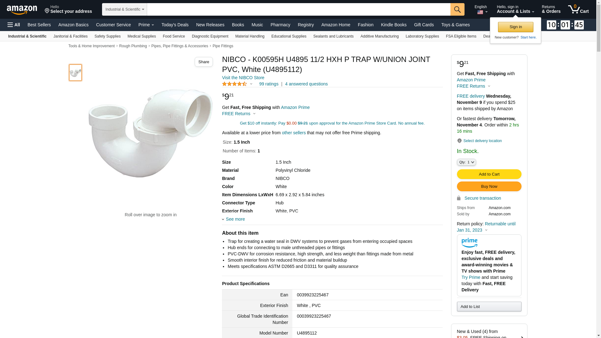 NIBCO 4895 Series PVC DWV Pipe Fitting, Trap, 1-1/2" Hub. Trap for creating a water seal in DWV systems to prevent ga...
