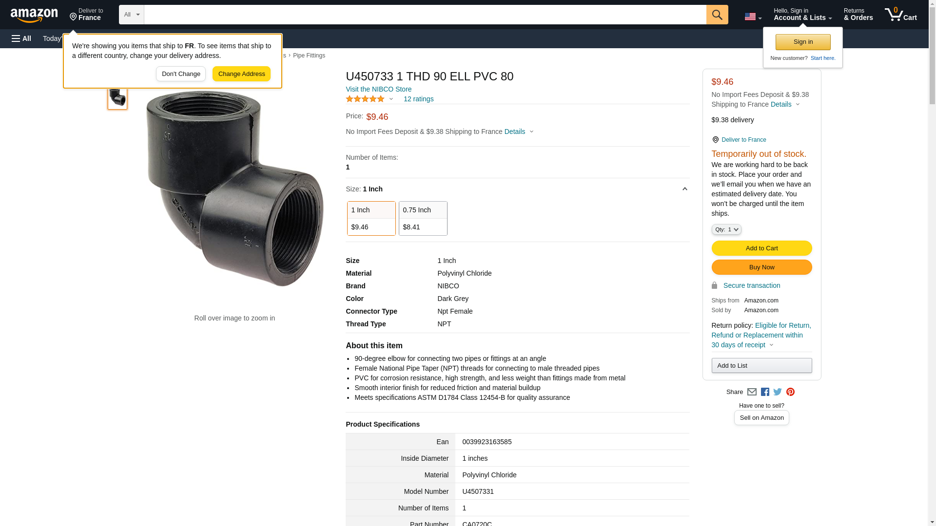 NIBCO 4507-3-3 Series PVC Pipe Fitting, 90 Degree Elbow, Schedule 80, 1" NPT Female. 90-degree elbow for connecting t...