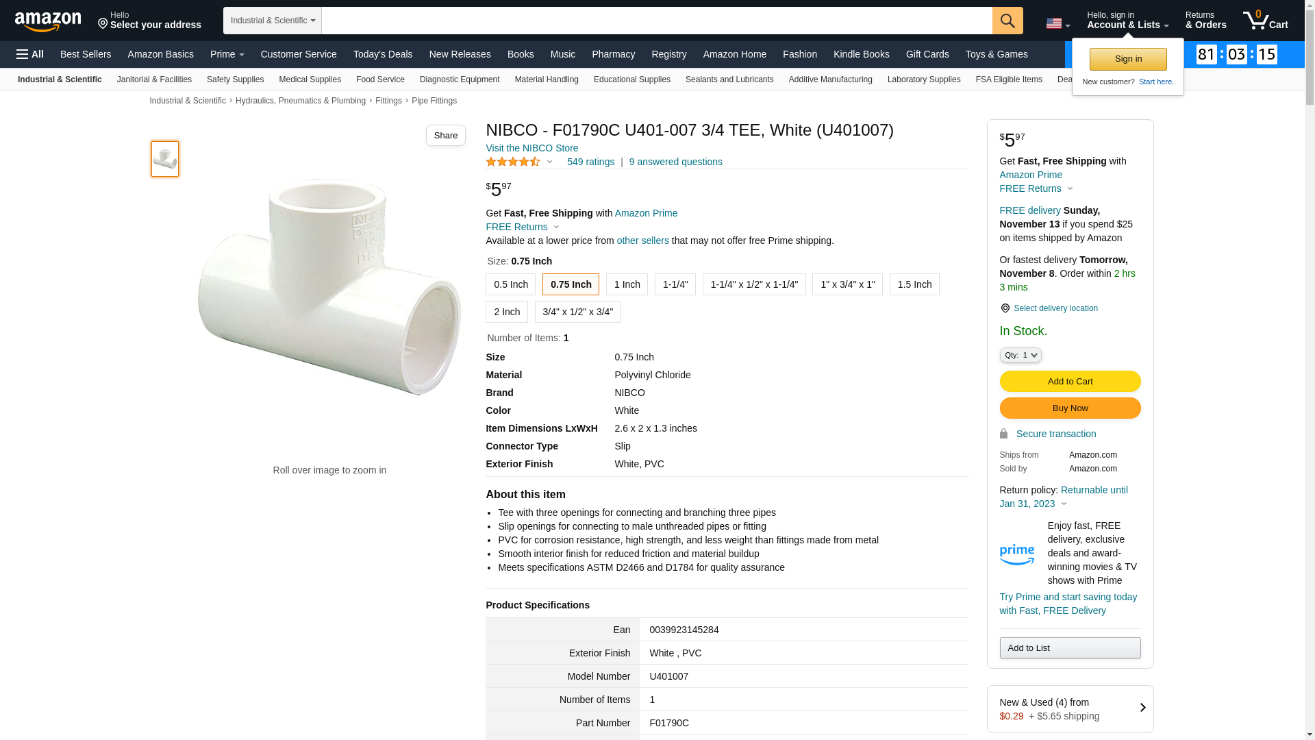 NIBCO 401 Series PVC Pipe Fitting, Tee, Schedule 40, 3/4" Slip. Tee with three openings for connecting and branching ...
