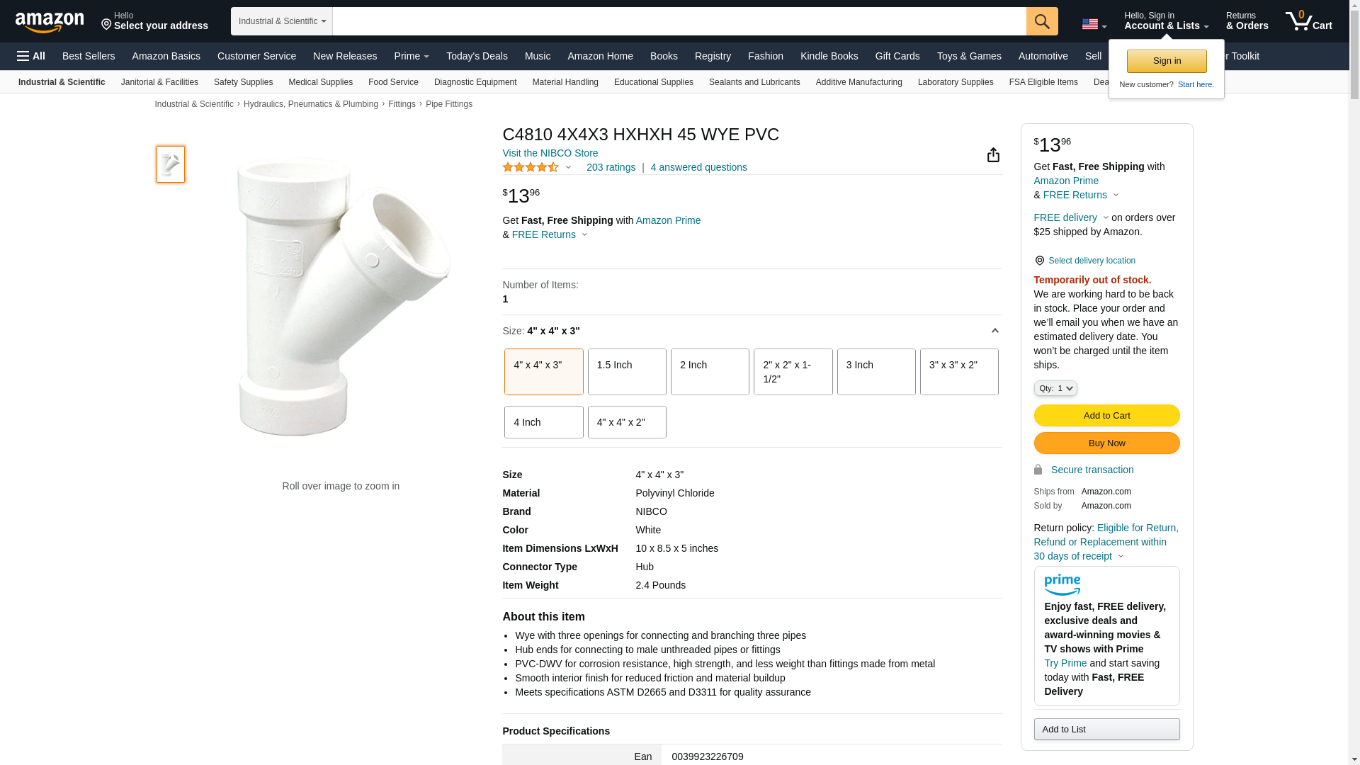 NIBCO 4810 Series PVC DWV Pipe Fitting, Wye, 4" x 4" x 3" Hub. Wye with three openings for connecting and branching t...