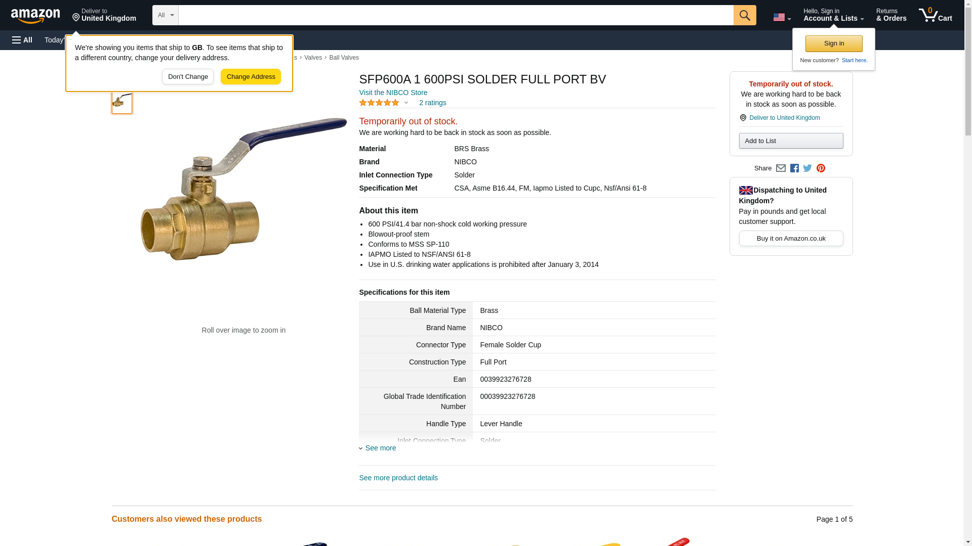 NIBCO S-FP-600A BRS Brass Ball Valve, Two-Piece, Lever Handle, 1" Female Solder Cup. 600 PSI/41.4 bar non-shock cold ...