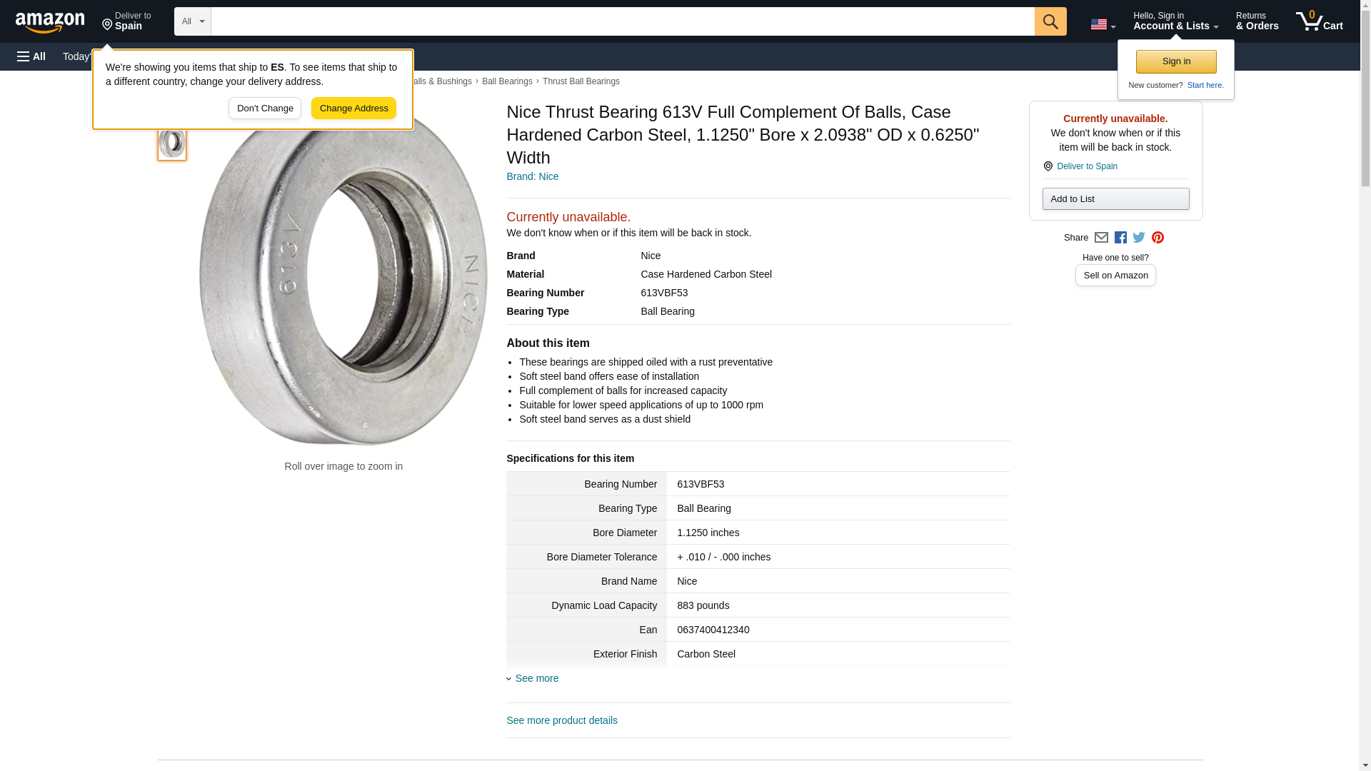 Nice Thrust Bearing 613V Full Complement Of Balls, Case Hardened Carbon Steel, 1.1250" Bore x 2.0938" OD x 0.6250" Width