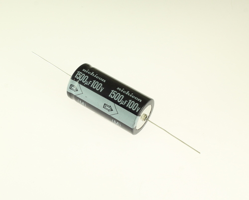 NICHICON capacitor: P/N TLB2A152MDA; capacitance = 1,500 uF, voltage = 100 VDC, tolerance = 20%, temperature = 85, lead type = axial; tlb2a152mda. aluminum electrolytic capacitor. axial leads. case size 25 x 50mm; 1500uf 20% 100vdc; (item ID: 2020069696)
