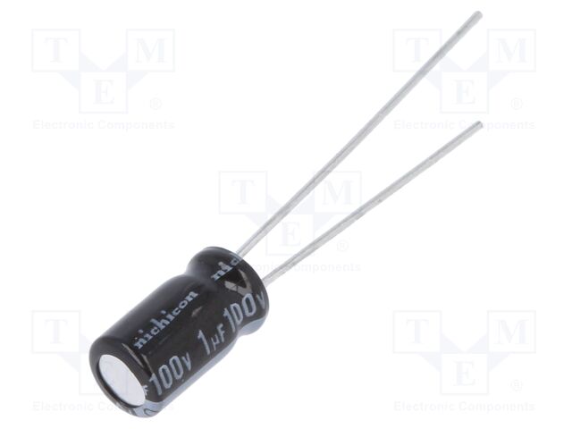 | Feature | Manufacturer: Nichicon Product Category: Radial Aluminum Electrolytic Capacitors RoHS: Capacitance: 1 uF Voltage Rating DC: 100 V Tolerance: 20 % Ripple Current: 12 mA Maximum Operating Temperature: + 105 C Termination Style: Radial Case Diameter: 5 mm Case Length: 9 mm Lead Spacing: 2 mm Product: High Temp Electrolytic Capacitors Brand: Nichicon Dimensions: 5 mm Dia. x 9 mm L |