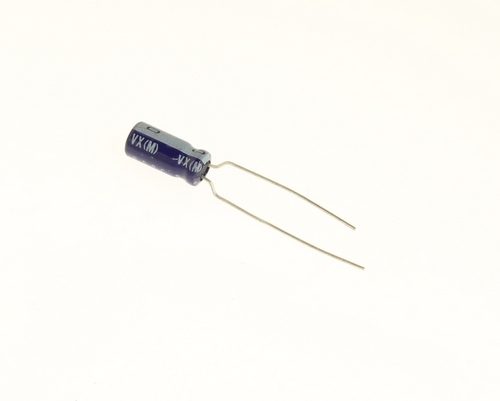 NICHICON capacitor: P/N UVX1HR15MDA; capacitance = 0.15 uF, voltage = 50 V , tolerance = 20%, temperature = 85, lead length = 22 mm (0.866 in), lead spacing = 5 mm (0.197 in), lead type = radial; aluminum electrolytic capacitor. radial leads. case size 5 x 11mm; 0.15uf 20% 50vdc; (item ID: 2020070389)