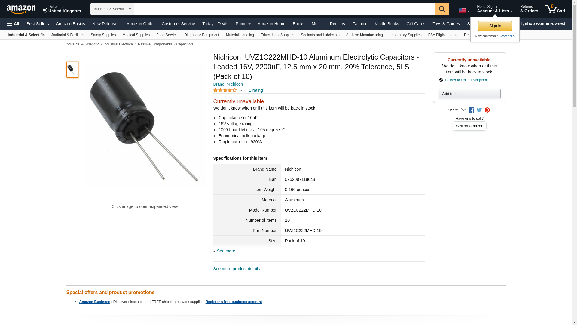 Nichicon UVZ1C222MHD-10 Aluminum Electrolytic Capacitors - Leaded 16V, 2200uF, 12.5 mm x 20 mm, 20% Tolerance, 5LS (Pack of 10)