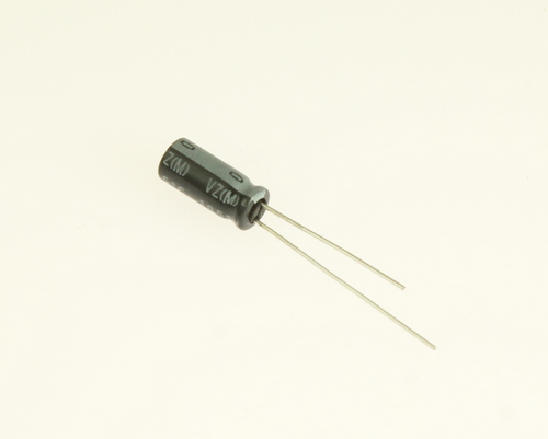 NICHICON capacitor: P/N UVZ1H010MDH; capacitance = 1 uF, voltage = 50 VDC, tolerance = 20%, temperature = 105, lead length = 17.78 mm (0.700 in), lead spacing = 2.54 mm (0.100 in), lead type = radial; uvz1h010mdh. aluminum electrolytic capacitor. radial leads. case size 5 x 11mm; high temperature-105c 1uf 20% 50vdc; (item ID: 2020070219)