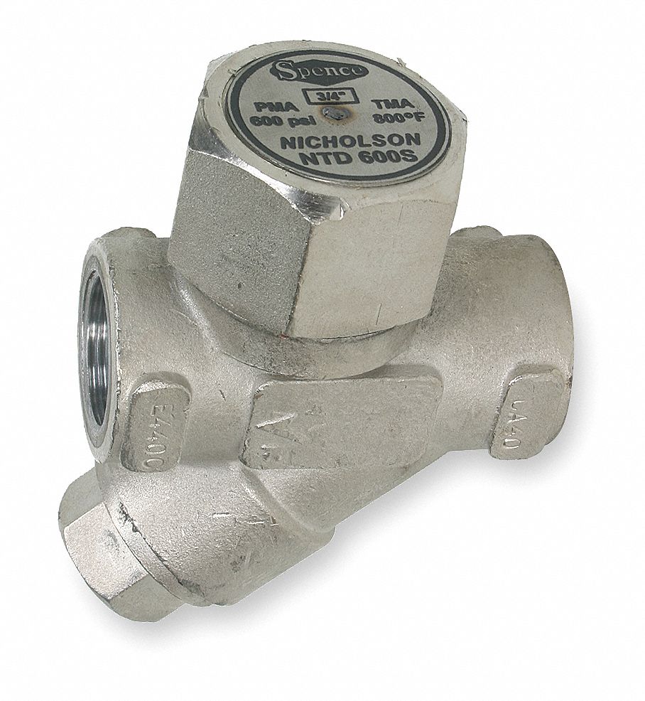 ' Steam Trap, Max. Operating PSI 600 psi, Max. Temp. 800 Degrees F, Body Material Stainless Steel, Downstream PSI Range 600 psi, (F)NPT Connections 3/4 In., NPT Inlet 3/4 In., NPT Outlet 3/4 In., Disc Material Stainless Steel, Pipe Configuration Straight '
