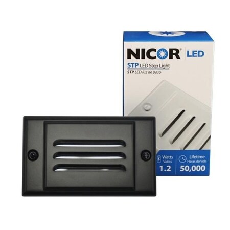 NICORs LED Step Lights are a great complement for your residential and commercial projects. This step light not only provides a touch of safety, but it offers a warm, natural glow making it a perfect accent for any project. The LED Step Light offers energy savings (using only 1.2 Watts) over the life-span calculated at over 50,000 hours. This Step Light is sealed and approved for use in wet locations, making it ideal for outdoor use on decks, porches, and pathways. Its also ideal to use indoors to light up hallways, stairways, or as a simple night light. The LED Step lights are available in White, Black, Nickel, and Oil-Rubbed Bronze Faceplates in either Vertical or Horizontal orientations. If you need a specific color, the White faceplates are also paintable. The Step Light features a warm 2700K color temperature. Protected by NICOR's 5 year limited warranty. <br /> <br />Features: <br /> - Includes an LED Module and a Black Horizontal Oriented Faceplate <br /> - Modular design allows fixture to be mounted in horizontal or vertical orientation <br /> - Constructed with die-stamped aluminum and powder-coated faceplates. <br /> - The Louvered faceplate design conceals LED's from direct line of sight while maximizing wide light distribution <br /> - The High Efficiency LED Step Light is maintenance-free and fully sealed to keep out water, dust, and the other elements. <br /> - The performance grade LED's and electrical driver provides optimal light output while using only 1.2 Watts of energy. <br /> - TM-21 Projected L70(6k) life 50,000 hours <br /> - Uses standard household Input voltage of 120V <br /> - Operating temperature rating of -10F to 122F (-23C to 50C) <br /> - Protected by NICOR's 5 year limited warranty <br /> <br />Specs: <br /> Finish: Black <br /> Product Type: LED Step Light <br /> Size: 4.5" <br /> Application: Residential <br /> Watts: 1W <br /> Volt: 120V <br /> Light Output (LM): 19 <br /> Color Temperature: 2700K <br /> Dimmable: No <br /> Bulbtype: LED <br /> Ratelife: >50,000 <br /> Bulbs Included?: Yes <br /> Recommended Bulb Type: LED <br /> Hardwire/Plug/Socket: Hardwire <br /> Product Length: 4.6 <br /> Product Width: 2.75 <br /> Product Depth: 2 <br /> Product Weight: 0.3 <br /> Limited Manufacturer Warranty (Year): 5 <br /> <br /> Certification: <br />-UL/cUL <br />- Energy Star Qualified: No <br />-FCC <br />-Wet Rated <br /> <br /> <br />