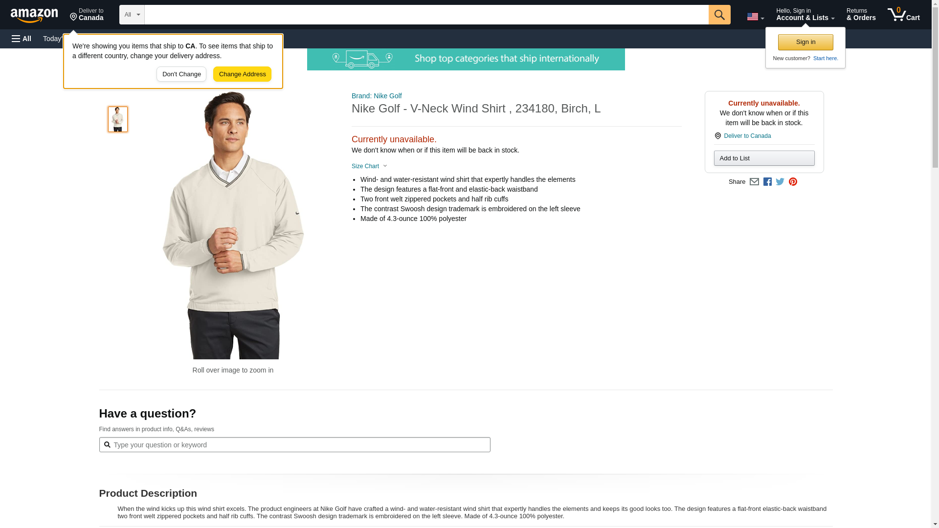 Nike Golf - V-Neck Wind Shirt , 234180, Birch, XS