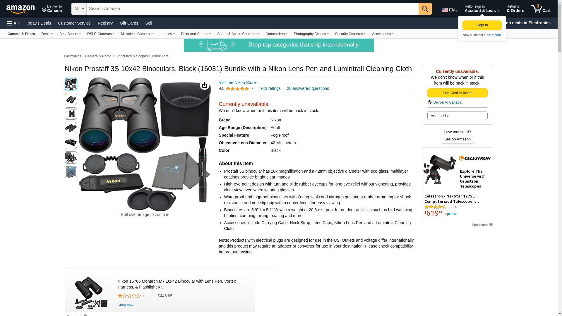 <p><strong>Nikon Prostaff 3S 10x42 with Carrying Case, Lens Caps, Strap, Nikon Lens Pen and Lumintrail Cleaning Cloth</strong></p><p>The Nikon PROSTAFF 3S binocular features 42mm objective lenses, yet the body is noticeably lightweight and compact to assure superb portability. In addition, the large field of view allows the user to locate the subject easily.</p><p>Other features include prisms with high-reflective silver-alloy mirror coatings and multilayer-coated lenses that provide bright and clear viewing. Also, turn-and-slide rubber eyecups with multi-click adjustments are included, allowing easy eye positioning at the correct eye point, even for eyeglass wearers.</p><p>With a large field-of-view, Nikon's legendary optical system, and a well-engineered housing that comfortably conforms to user's eyes and hands, Nikon's PROSTAFF 3S binocular is ideal for hunting, hiking, birdwatching, observing sporting events, and other outdoor activities.</p><p><strong>Key Features:</strong></p><ul><li>Compact and lightweight 42mm-objective lens diameter</li><li>Wide apparent field of view (62.9° for 10x42)</li><li>Multilayer-coated lenses for bright images</li><li>Long eye relief design</li><li>Lead- and arsenic-free glass used for all lenses and prisms</li><li>Turn-and-slide rubber eyecups with multi-click adjustment</li><li>Waterproof (up to 1m/3.3 ft. for 10 minutes) and fog-free with O-ring seals and nitrogen gas</li><li>Rubber armoring for shock resistance and a firm, comfortable grip</li><li>Lightweight body uses fiberglass-reinforced polycarbonate resin</li><li>Includes carrying case, strap, lens caps, Nikon Microfiber Cleaning Cloth, Nikon Lens Pen, and Lumintrail Keychain Light</li></ul>
