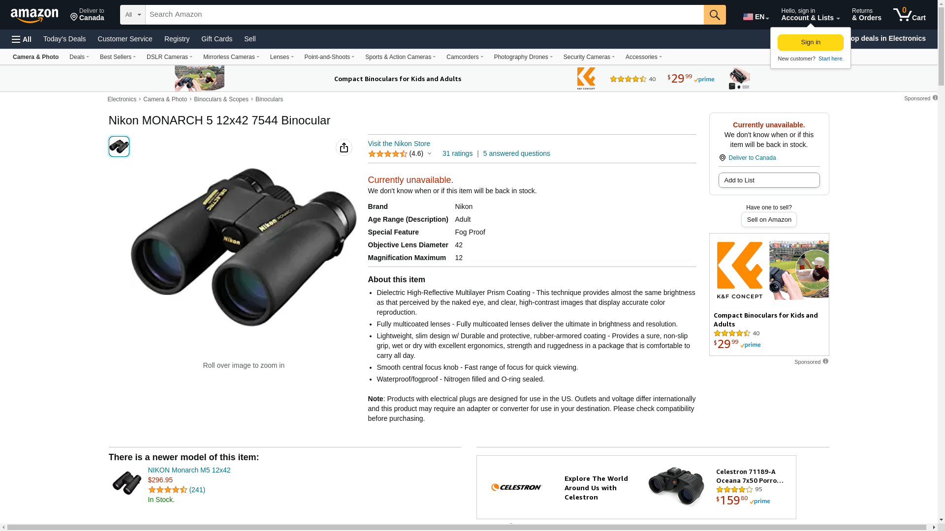 The new Nikon MONARCH 5 All Terrain Binocular couples bright, high-resolution optics with legendary ruggedness in a package that is light enough to carry all day. Incorporating Nikons exclusive Eco-Glass (made without the use of arsenic or lead) for all lens and prism elements, the roof prism MONARCH 5 features dielectric high-reflective multilayer prism coatings for extreme brightness, superior sharpness and incredible low light performance. The tough, full rubber armored body is O-ring sealed and nitrogen purged for a lifetime of waterproof, fogproof reliability. Available in 8x42, 10x42 and 12x42 black and Realtree APG models. <br /> <b>SKU:ADIB006XGG3HE</b>