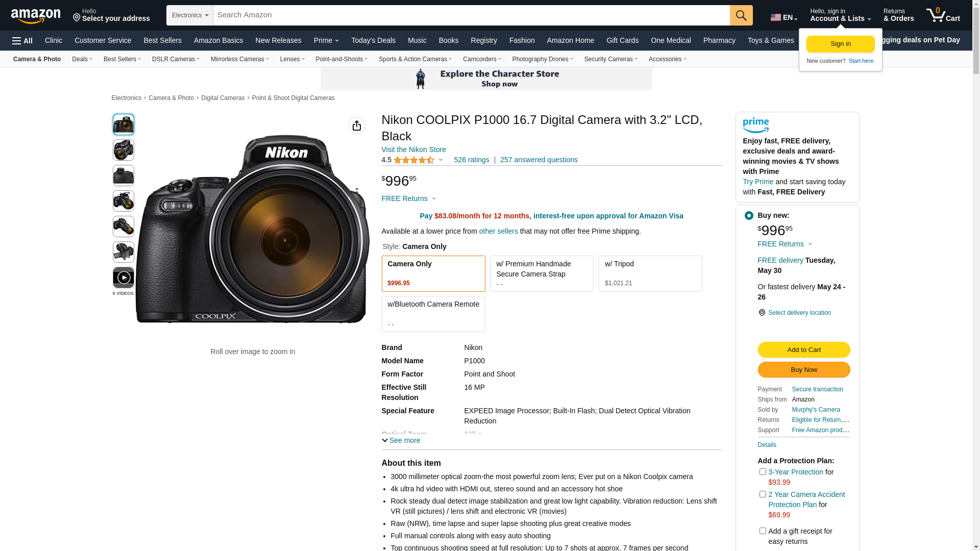 - Shoot farther with the 125x Super Zoom Nikon COOLPIX P1000 Digital Camera - 16MP CMOS sensor and a built-in lens with a 35mm equivalent of 24-3000mm