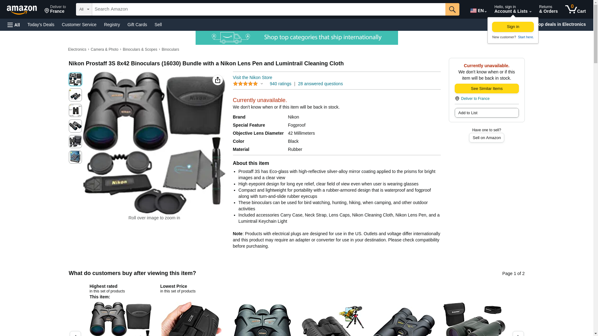 <p><strong>Nikon Prostaff 3S 8x42 Includes Carrying Case, Lens Caps, Neck Strap, Nikon Lens Pen and Lumintrail Cleaning Cloth</strong></p><p>Nikon black 8x42 prostaff 3S binoculars features silver-alloy coated roof prisms and anti-reflection multi-coated optics that produce bright and clear high-contrast Images with true color rendition across its entire field of view.</p><p>Its 8x magnification brings subjects up-close without the noticeable hand-shake often associated with higher power optics. The combination of prisms, optical coatings, and a respectable angle of view, users can enjoy an immersive observational experience in most lighting conditions, and even in the most extreme weather. </p><p><strong>Features: </strong><br><br> </p><ul><li>8x magnification</li><li>42mm objective lenses</li><li>Optical system created from lead-and-arsenic-free Eco-Glass</li><li>Multilayer coatings, which provide high light transmittance across the entire visible light spectrum</li><li>High-eyepoint design for long eye relief without vignetting</li><li>Rubber-armored coating to provide a non-slip grip, even in the wettest conditions</li><li>Angle of View: 7.2 degrees (real)</li><li>Feild of View: 377 degrees at 1000 yds</li><li>Nitrogen filled, waterproof and fogproof</li><li>Weight: 19.93 oz</li><li>Dimensions: 6.0 x 5.1 x 2.0"</li></ul>