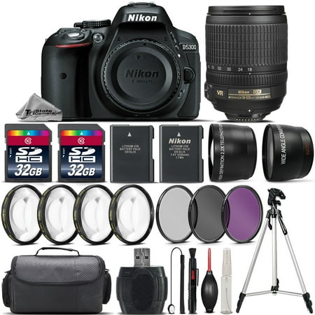 - THIS NIKON CAMERA BUNDLE CONTAINS: Nikon D5300 DSLR Digital Camera with Lens Kit (Black) + Nikon AF-P DX NIKKOR 18-55mm f/3.5-5.6G VR Lens + SanDisk 64GB Ultra SDHC SD Memory Card + EN-EL14a Compatible Lithium-Ion Battery + Large Digital Camera Gadget Bag + 55mm Telephoto Lens + 55mm to 58mm Step-Up Ring + 55mm Professional UV Filter + 55mm 3-Piece Filter Kit + 55mm Tulip Lens Hood + USB SD Card Reader + Memory Card Wallet + Deluxe Cleaning Kit + Limited 1-Year Warranty + More