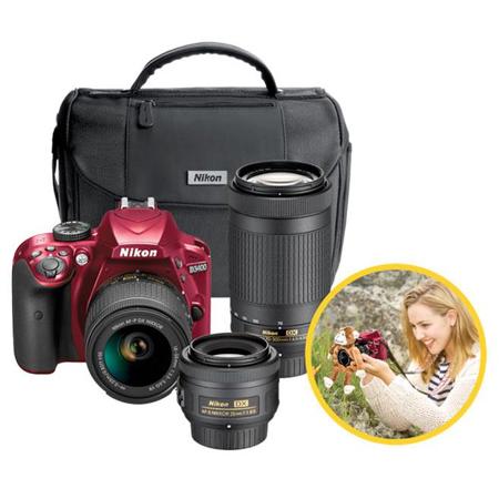 Nikon D3400 24.2 MP Triple Lens Ultimate Parent's Camera Kit, 3.0", Red