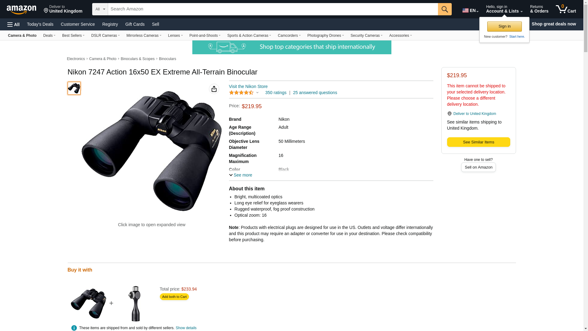 <p>Nikon Action EX Extreme All-Terrain Waterproof Binoculars are designed to appeal to binocular users who value tough construction and reliable optical performance under even the most extreme conditions. Nikon Extreme binoculars feature an all-metal chassis with lens fittings housed in a tough, lightweight polycarbonate body shell. The Nikon Binocular body is ergonomically shaped, tripod adaptable and rubber coated for a non-slip grip, whether wet or dry. The Action EX Series binoculars each feature a unique, click-stop eyecup design that not only delivers long eye relief, but also allows for variable eye relief that is customizable to the user's own eyes and eyeglasses. The binoculars are central focus with a diopter control to correct for normal right/left eye vision imbalance. Nikon Extreme Action 16x50mm Binoculars feature an Apparent Angle of View of 52.1 degrees, making them true wide angle binoculars.</p> <p><strong>Features:</strong></p> <p>Rugged waterproof, fogproof construction</p> <p>Rubber armor for sure grip</p> <p>Bright, multicoated optics</p> <p>Turn-and-Slide rubber eyecups</p> <p>Long eye relief for eyeglass wearers</p> <p>Quick central focusing</p> <p>Diopter control for strain-free viewing</p> <p>BaK4 High Index Prisms</p> <p>Includes neck strap and case</p> <p><strong>Specifications:</strong></p> <p>Type of Prism: Porro</p> <p>Magnification: 16x</p> <p>Objective Diameter: 50 mm</p> <p>Real Angular Field of View: 3.5°</p> <p>Apparent Angle: 52.1°</p> <p>Field of View (at 1000 yards): 183 ft.</p> <p>Exit Pupil: 3.1 mm</p> <p>Close Focus Distance: 7 meters / 23 ft</p> <p>Relative Brightness: 9.6</p> <p>Eye Relief: 17.8 mm</p> <p>Interpupilary Distance: 56 - 72 mm</p> <p>Rubber Coated (Armored): Yes</p> <p>Waterproof: Yes</p> <p>Fogproof: Yes</p> <p>Dimensions L x W x H: 7.0 x 7.7 x 2 in.</p> <p>Weight: 36.7 oz.</p>