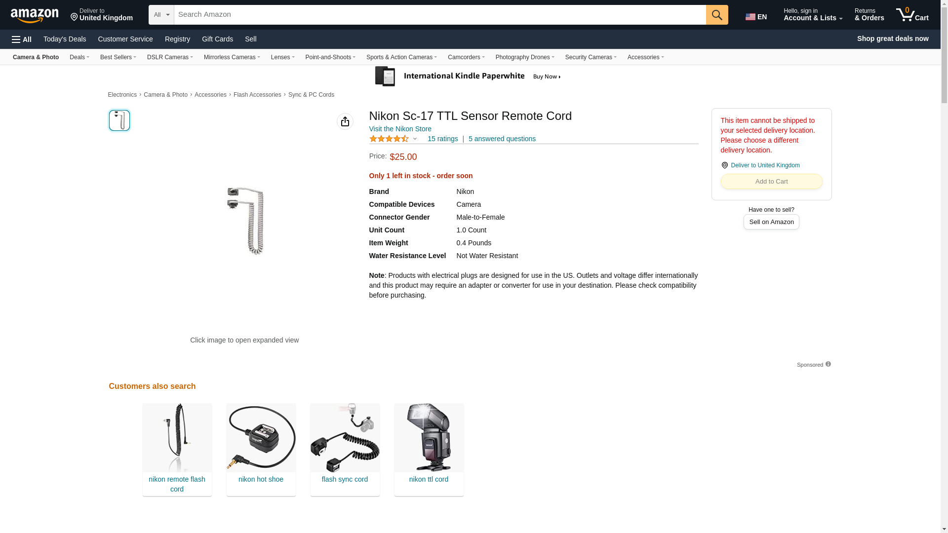 Nikon TTL remote cord for use with a Nikon SB15 or SB16B electronic speedlight flash.