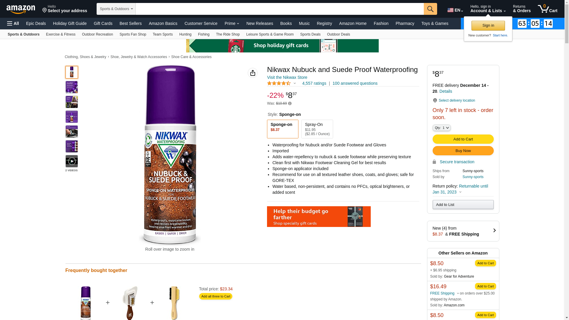 Sponge-on waterproofing / Spray-on waterproofing. Waterproofs, maintains support and breathabilityNikwax Nubuck & Suede Proof Features: Adds water repellency Prolongs life and performance of all nubuck or suede footwear Maintains breathability Ideal for footwear with breathable linings e.g. Gore-Tex Can be used on wet footwear Easy to apply - available in spray-on or sponge-on formats. Can be used indoors unlike solvent based sprays WaterBased - environmentally friendly, biodegradable, non flammable, non hazardous Does not contain fluorocarbons Style number 771