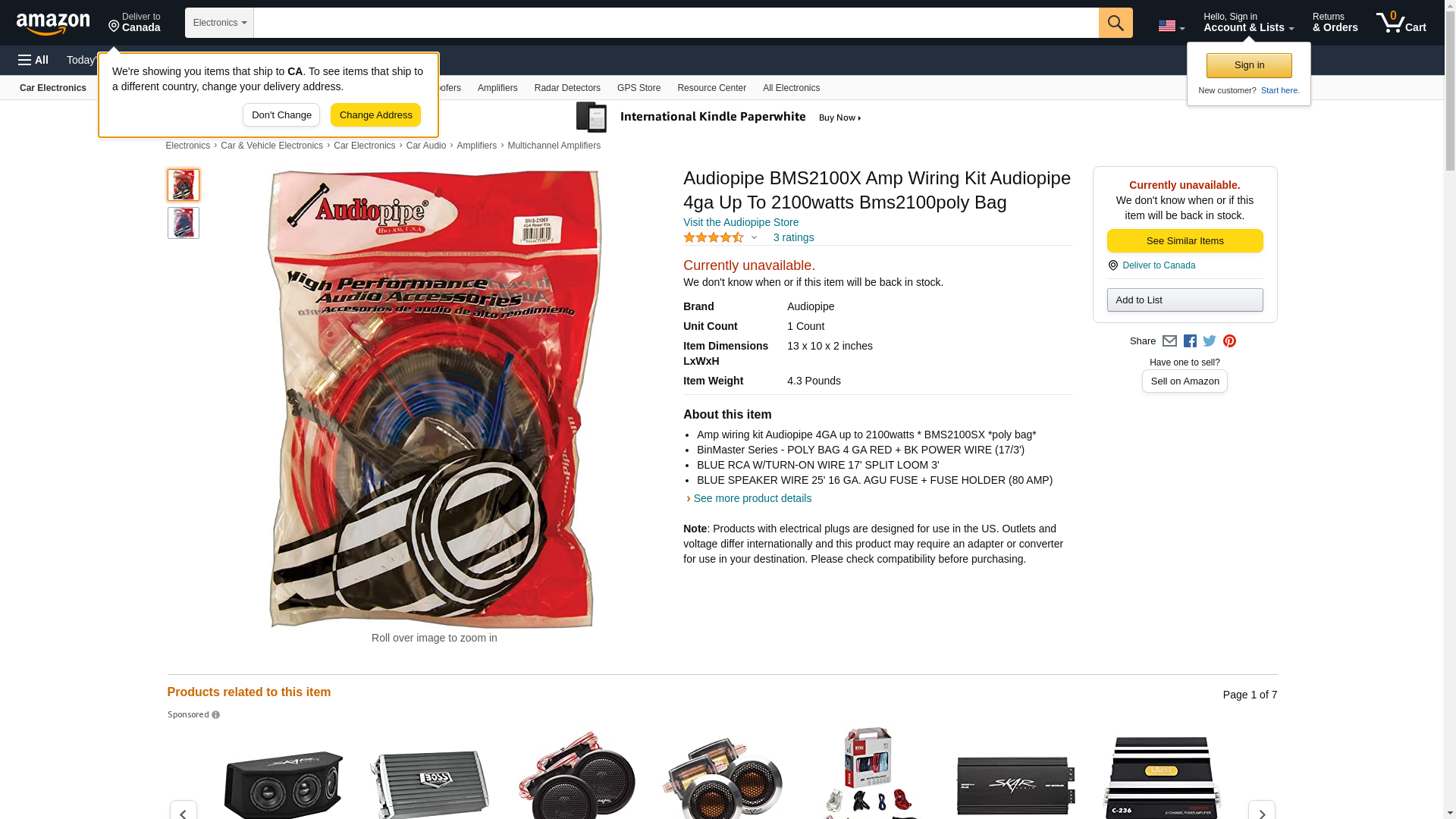 | Feature | Amp wiring kit Audiopipe 4GA up to 2100watts * BMS2100SX *poly bag* |
