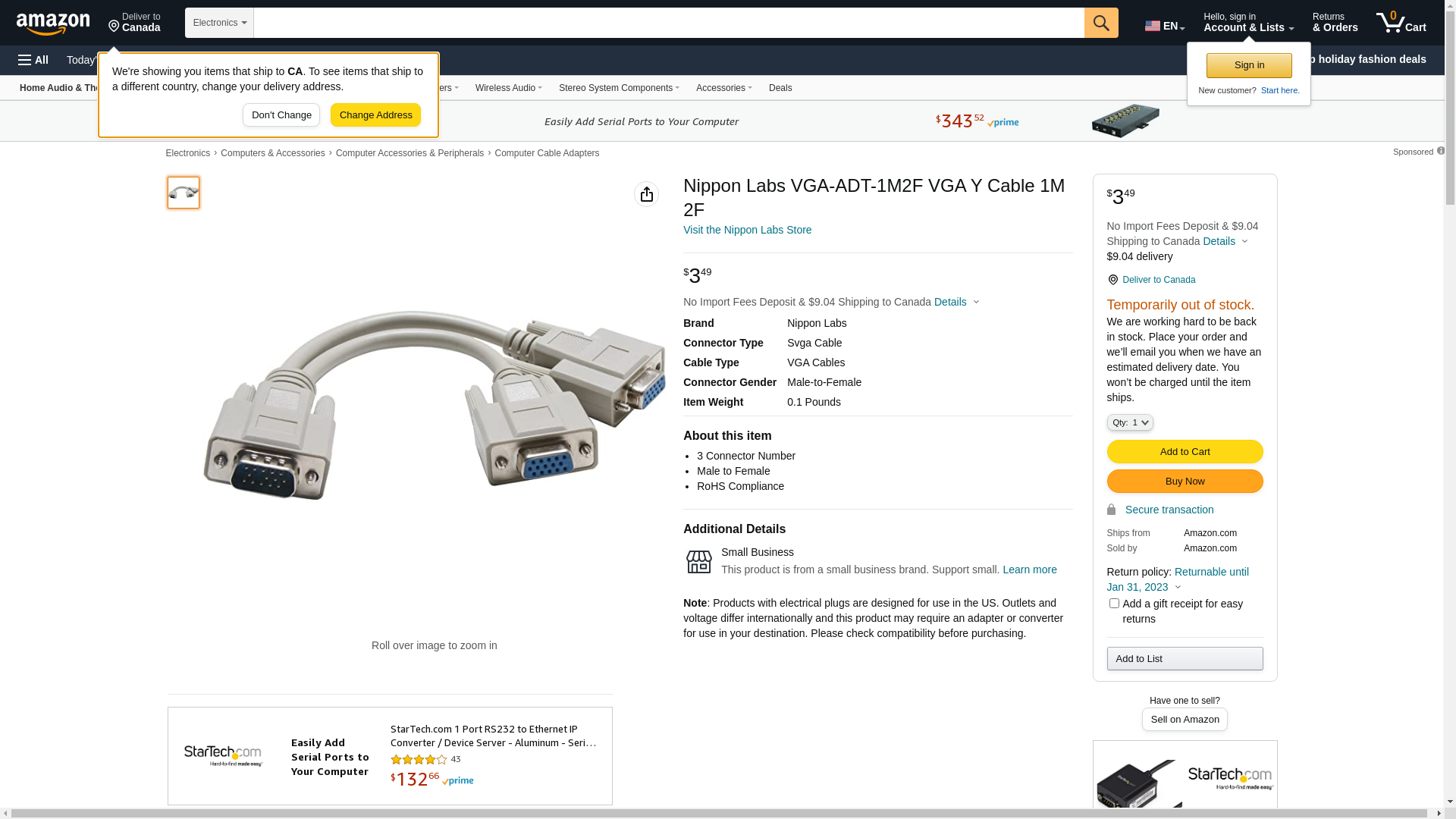Nippon Labs VGA-ADT-1M2F VGA Y Cable 1M 2F. 3 Connector Number. Male to Female. RoHS Compliance