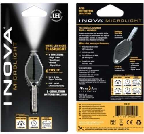 Light your way with the Nite Ize Inova LED Microlight. The light features a white LED bulb that produces a powerful beam of light for up to 22 hours on low or up to 15 hours on high. It features high, low, strobe and signal modes for versatile use, and it functions in temperatures ranging from -4°F to 104°F. Easy-to-open snap-shut construction allows for simple replacement of the included two 2016 lithium batteries, and the durable stainless-steel clip attaches securely and releases quickly.
